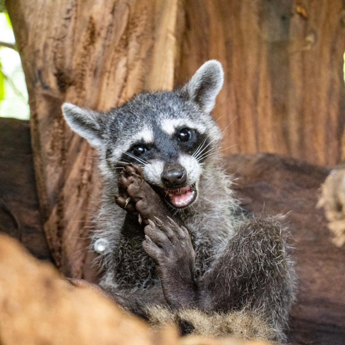 Despite being more solitary by nature, this raccoon has formed a close bond with Jessie, its coati friend.